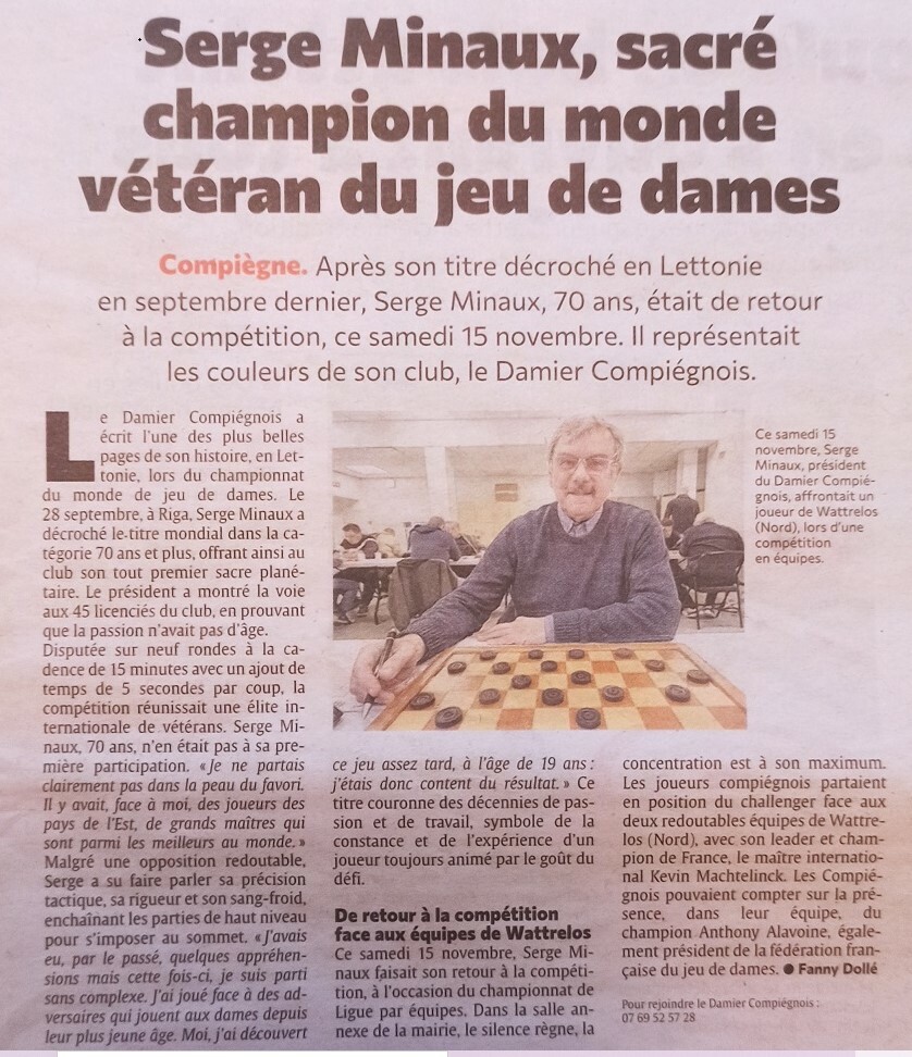 Le championnat du Monde Vétérans s'est déroulé du 21 au 28 septembre dans la capitale de la Lettonie à RIGA . Le Compiégnois Serge MINAUX Champion du Monde Vétérans des plus de 70 ans. Photo: article de Fanny DOLE du Courrier Picard